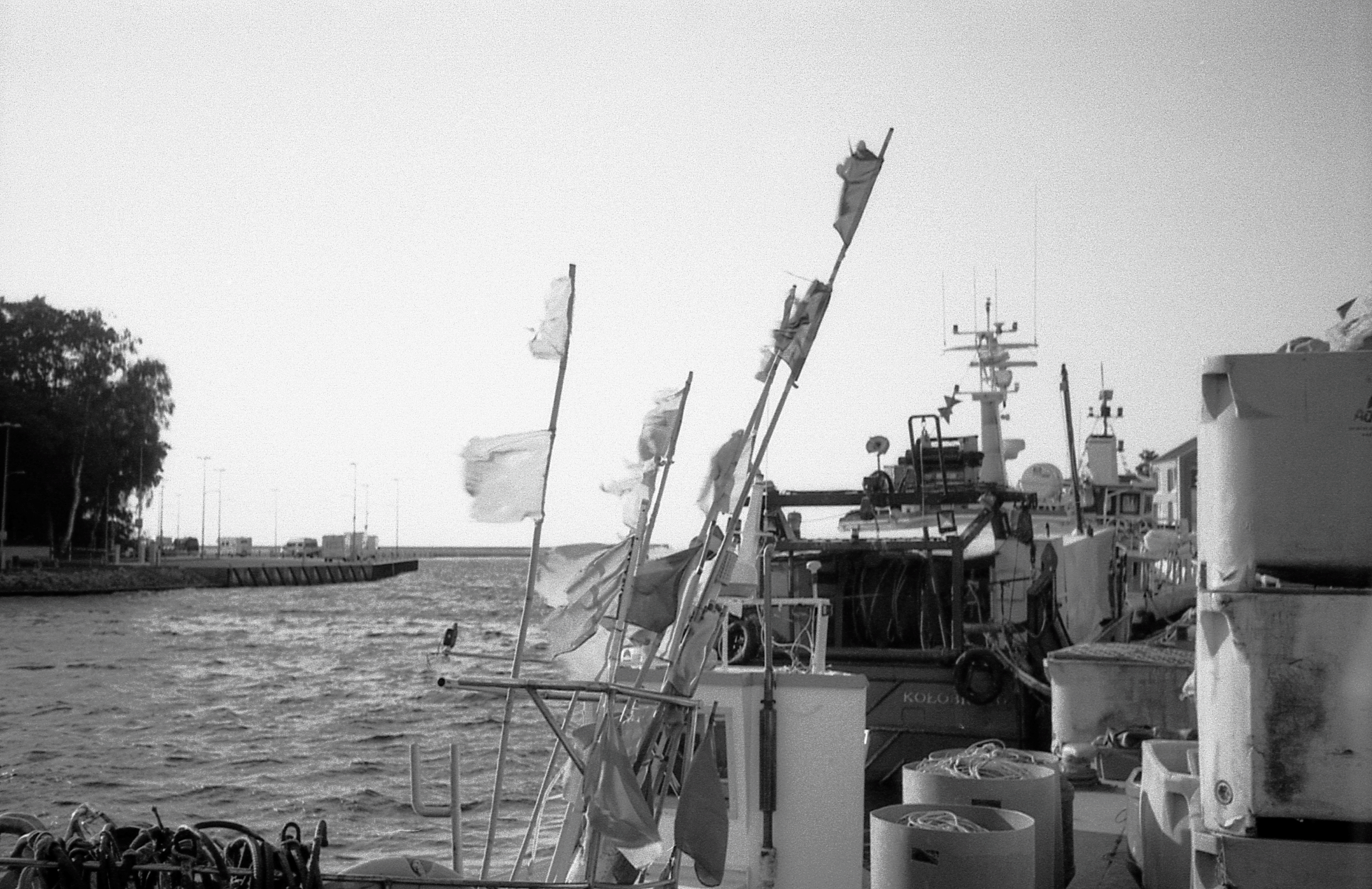To zdjęcie zatrzymuje moment codzienności, który zwykle umyka uwadze – scena z portu, pełna detali, ale pozbawiona patosu. Flagi na masztach łodzi łopoczą na wietrze, jakby próbowały opowiedzieć historię dnia, pracy, rutyny i czekania. Czarno-biała tonacja usuwa wszystko, co zbędne – zostaje tylko światło, forma i rytm. Fale w tle są spokojne, niemal niezauważalne, ale obecne, podobnie jak cały pejzaż morski, który nie musi dominować, by być odczuwalnym.